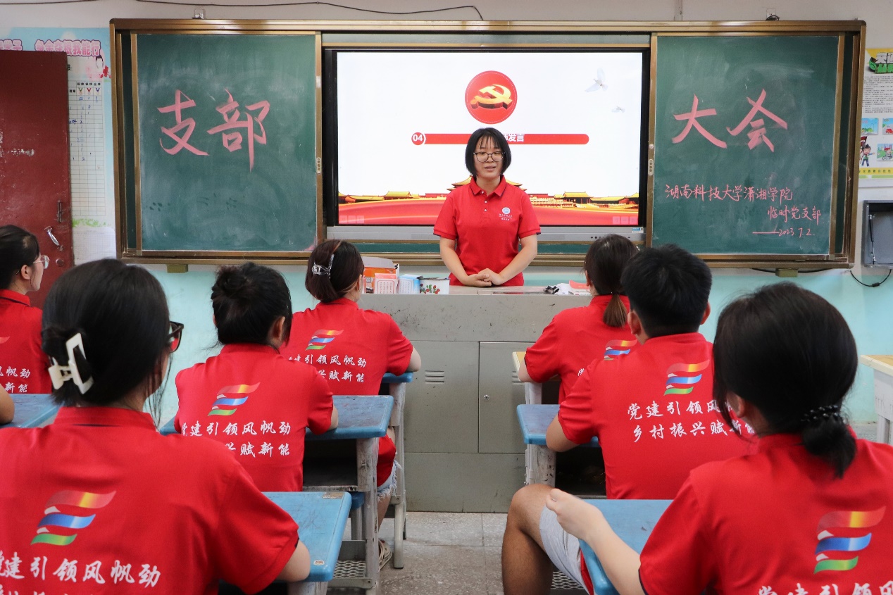 大会伊始,罗茜首先宣读成立临时党支部通知并带领党支部成员重温入党誓词、观看第二十届中共中央政治局第六次集体学习视频,同时号召大家深入贯彻习近平总书记关于党建引领乡村振兴的思想精神,发挥党员先锋模范作用,担负起阵地建设、政治教育等党建职责,以实际行动助力乡村振兴发展,带动实践队全体成员做好本次暑期社会实践活动。