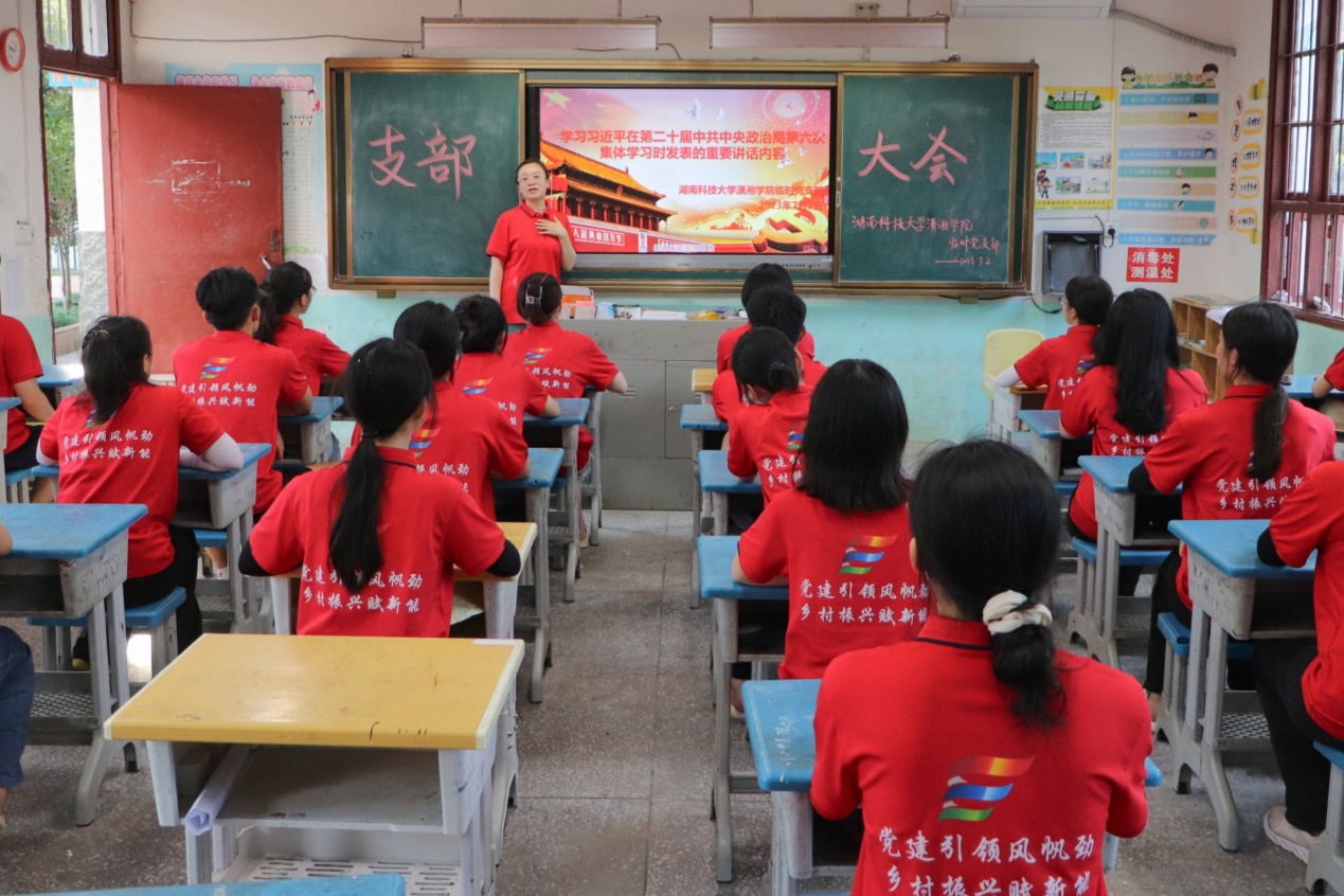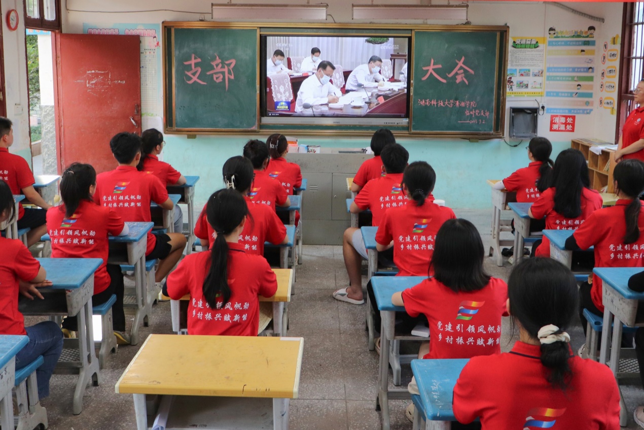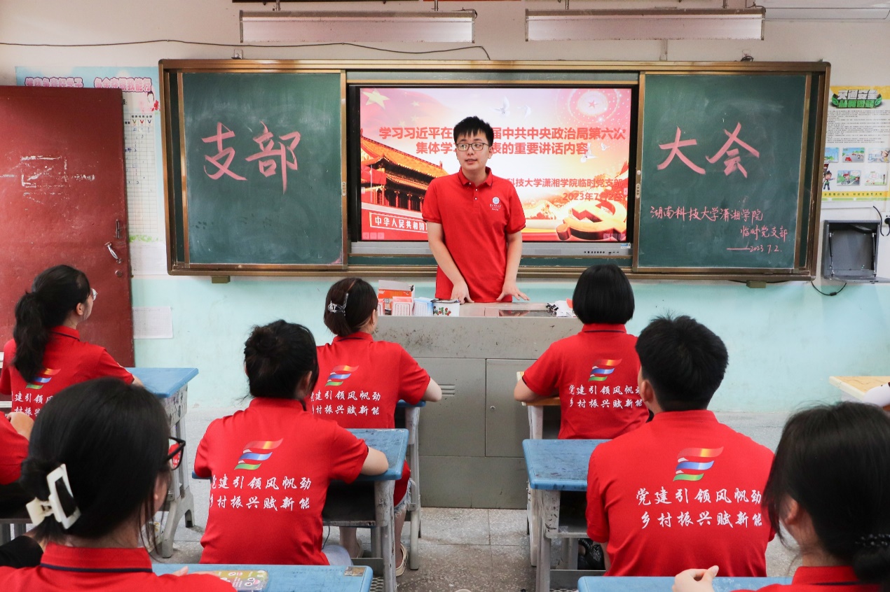 为深入学习贯彻习近平新时代中国特色社会主义思想,充分发挥党组织战斗堡垒和党员先锋模范作用,努力将学院学生培养成为担当民族复兴大任的时代新人,7月2日下午,我院于湖南省怀化市通道县木脚完全小学观看习近平在第二十届中共中央政治局第六次集体学习重要讲话内容视频。学院暑期“三下乡”实践团临时党支部全体成员共同观看。